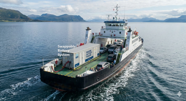 교체식 배터리 시스템으로 운항하는 연안선박 개념도(Nano Banana 생성 이미지)