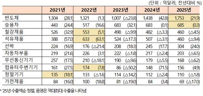 네 번째 키워드인 ‘K-기업의 저력’은 어려운 대내외 여건 속에서도 확인됐다. 반도체·승용차·철강·석유제품·선박 등 5대 주력 품목이 전체 수출의 51.7%를 차지했다. 승용차 수출은 미국 수출 감소에도 불구하고 유럽연합과 캐나다 등으로 시장을 넓히며 전년 대비 0.3% 증가했다.