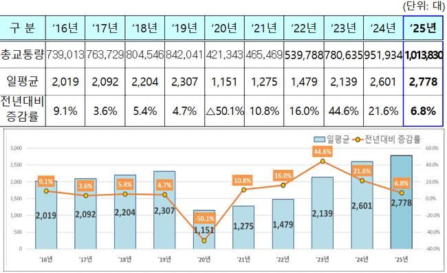 국토교통부는 2025년 한 해 동안 국내외 모든 항공기 운영자가 제출한 비행계획서를 기준으로 집계한 결과, 총 101만여 대(하루 평균 2,778대)의 항공기가 우리나라 하늘길을 이용했다고 밝혔다. 이는 전년 대비 6.8% 증가한 수치로, 연간 기준 첫 100만 대 돌파다.