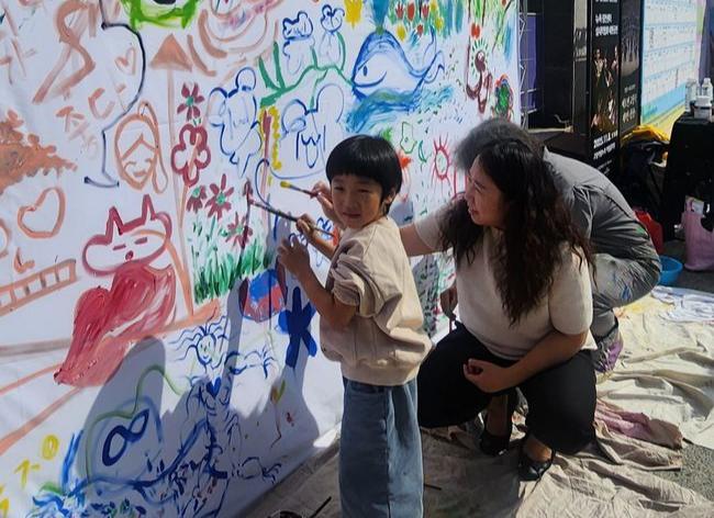 낮 12시 아람누리 해받이터에서는 그림책 작가 김중석이 ‘함께 그리니까, 좋다’를 주제로 2시간 동안 그림 그리기 공연을 진행했다. 참가자들은 실시간으로 그림책이 완성되는 과정을 지켜보며 창작의 즐거움을 느꼈고, 어른과 아이 모두 따뜻한 이야기 속에 공감했다.