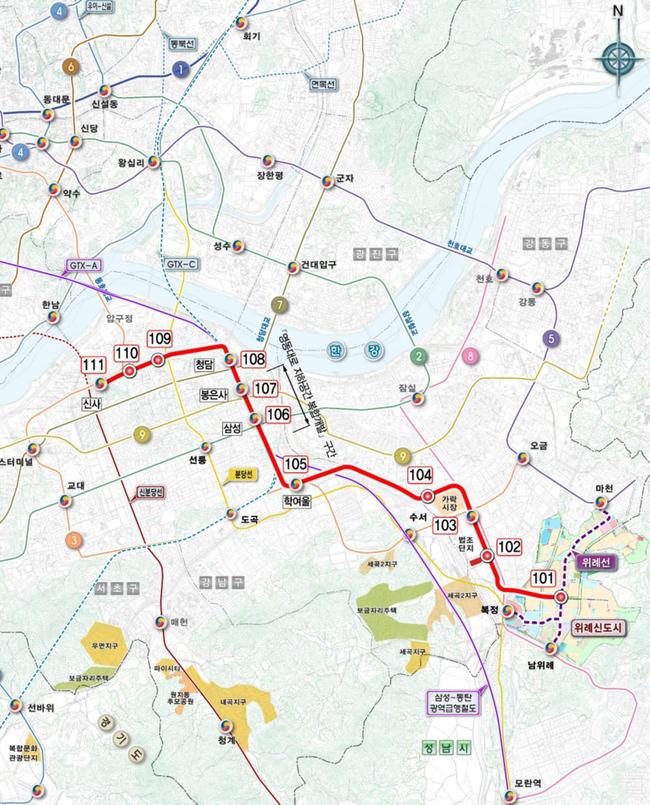 또한 위례선과 서울 지하철 2·3·7·8·9호선, 신분당선 등 주요 철도망과의 환승이 가능해지고 강남권 중심업무지구에서 GTX-A·C 노선과의 연계도 가능해져 수도권 광역 철도 네트워크 확충 효과도 기대된다.