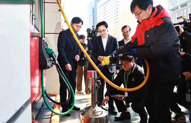 김정관 산업통상자원부 장관이 13일 서울 마포구 도화동에 위치한 SK에너지 직영 주유소를 방문해 관계자로부터 최근 석유 가격 동향을 청취한 뒤 석유제품 가격 · 품질 · 유통 검사 과정을 참관하고 있다. 김 장관은 최고가격제 시행 이후 국민이 체감할 수 있는 석유 가격 안정을 위해 판매가격을 안정적으로 유지해 줄 것을 요청했다.